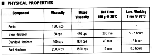 The low initial viscosity allows laminates to be produced by contact pressure vacuum or pressure bag techniques filament winding or vacuum assisted resin injection. Thorough wetting of reinlorcement fibres is ensured by the low viscosity and excellent air release properties of the resin/hardener mixture This in particular assists with the impregnation of aramid and carbon fibres.