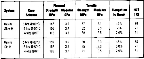 There is a considerable increase in glass transition temperature and toughness of the system with the elongation at break increasing to approximately 6.5%. The post cure need not be carriedoutimmediately after laminating and it is possible to assemble several composite components and postcure the entire assembly together It is recommended however that elevated temperature curing should be completed before any final painting/finishing operations. Furthermore, care shoud be taken to adequately support the laminate if it is to be postcured after demoulding and the laminate must be allowed to cool betore the support is removed.