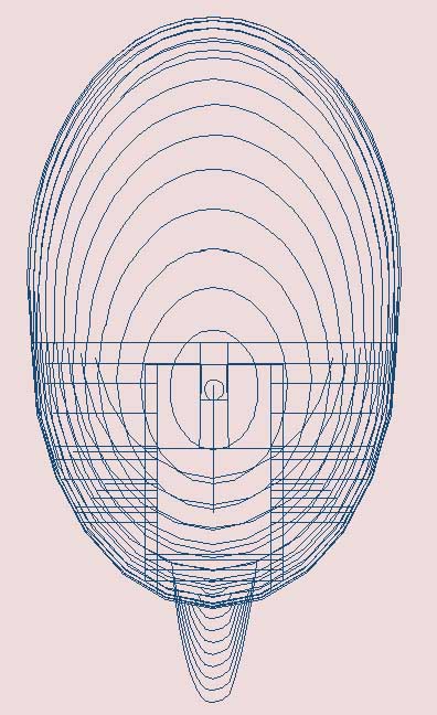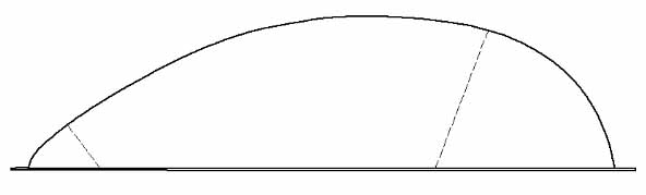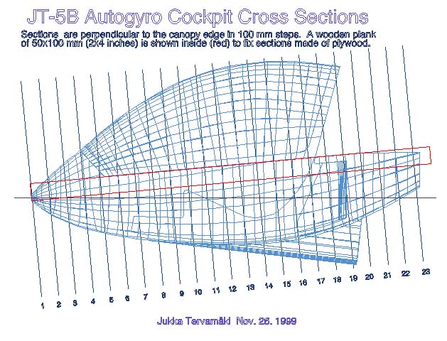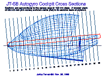 Free blowing of plexiglass sheet gives a different shape than shown on these cross sections. The blown sections will be perfect arcs (part of a circle, not an ellipse). The original JT-5 canopy had a round cross section in the middle but I bent (forced) the free rear end into an elliptical shape when bonding to the canopy frame. This gave a better air flow into the engine cooling inlets behind the canopy. The pictures below give a fairly good idea of the canopy and pod cross sections (and me too!)