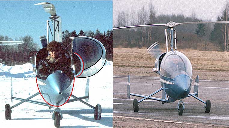 I also improved the canopy shape in the virtual model and the comparison can be seen on the picture below right. The real machine and model are sitting on the runway with the rotors tangled! The model canopy is now closer to a free blown shape and the new sections are in the pdf file.NOTICE! Section 14 was erroneously same as No13. This has been corrected Dec.3.1999 on both the A1 and A4 size files. However, my Acrobat distiller made some strange artifacts on the A4 size file, page one. It is readable though.