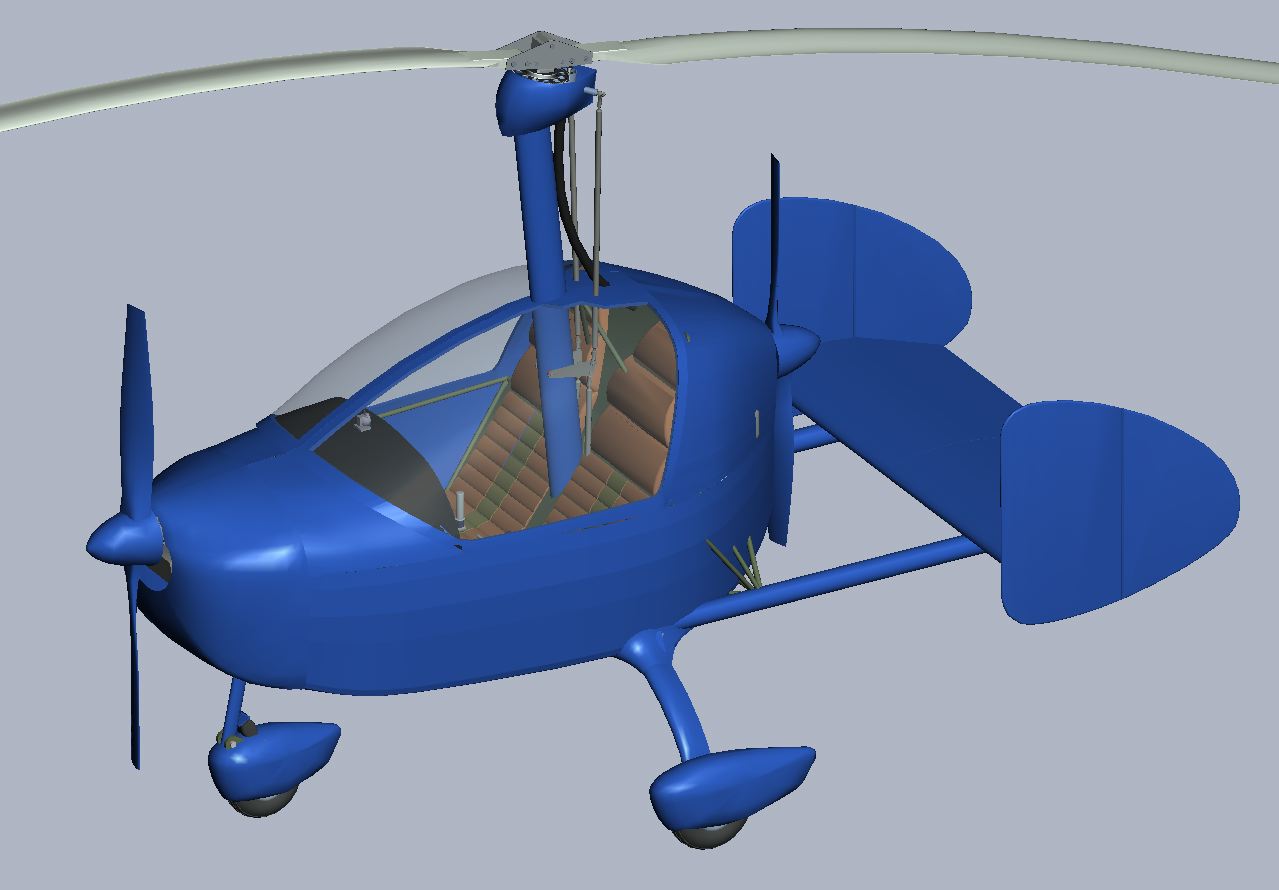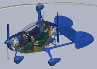 JT-11, a 2-seat tractor gyro with a pusher engine! The JT-11 autogyro concept is a 3D modelling project with the purpose of evaluaiting a side by side tractor gyro design with no compromises in pilot visibility, propeller efficiency, gyro loading or the CG position. Why a tractor? Pusher gyros have two main benefits, good helicopter like visibility from the cockpit and a fairly simple load carrying structure, with all main loads (engine, pilot, fuel tank and main landing gear) attached to the rotor mast. The biggest drawback of pusher gyros is the limited space (between keel tube and rotor) for an efficient propeller. In a tractor gyro one can use an airplane-like big diameter propeller offering a much improved efficiency. Side-by-side seating is a much preferred seating arrangement by many pilots. However, in gyros, pushers or tractors, this arrangement creates a problem with the CG position when the gyro is flown with one very light pilot or with two heavy ones. In tandem gyros this problem is avoided. The pilot balances the engine weight and the passenger is seated right in the CG-position. The gyro can be flown with or without a passenger with minimal CG-shift. With the JT-11 concept I wanted to achieve the following goals: 1) A tractor design with a big, efficient propeller I achieved these goals by placing a part of the power plant (the engine) in the back and another part (propeller, reduction unit, cooling radiators and the battery) in the front of the aircraft. This arrangement balances the empty aircraft so that the longitudinal CG position is right where the pilots are sitting and by placing fuel tanks under the seats all the changing usefull load is in the CG. I am not the first one to figure out this arrangement. Although no such gyros exist today, Harold Pitcairn was the designer of the thirties who extensively used this arrangement in his last gyro designs. The Pitcairn PA-36 or AC-35 (?)